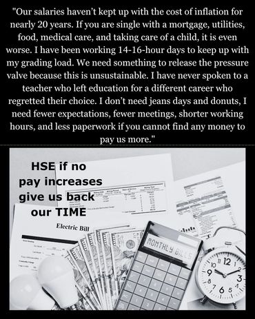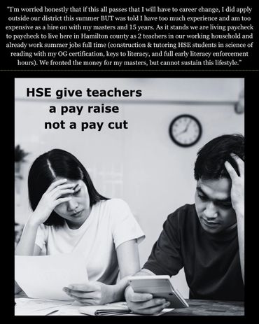 “As a third-year teacher, I am financially hanging on by a thread. To be frank, I take home $3,000 a month That is enough for my car payment, rent, student loans, bills, groceries, and almost nothing else. How am I ever supposed to afford children? How am I ever supposed to afford a wedding? How am I ever supposed to afford a house? I got into this profession because of my passion for teaching and my passion for students, but I cannot stay if my pay does not increase or even decreases.”